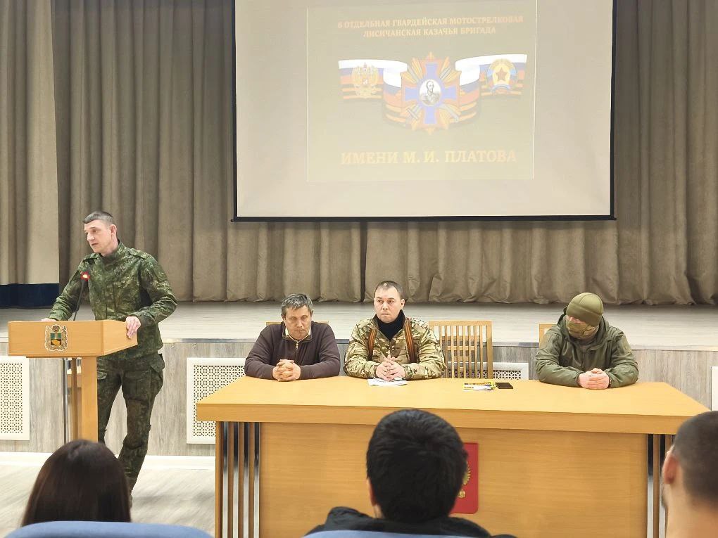 19 февраля 2026 года в стенах колледжа прошла встреча выпускников с представителями Министерства обороны Российской Федерации: гвардии сержантом Матрёниным Вячеславом Викторовичем (в/ч 54801), Макрусовым Юрием Юрьевичем (в/ч 41600) и участником СВО с позывным «Меч».
