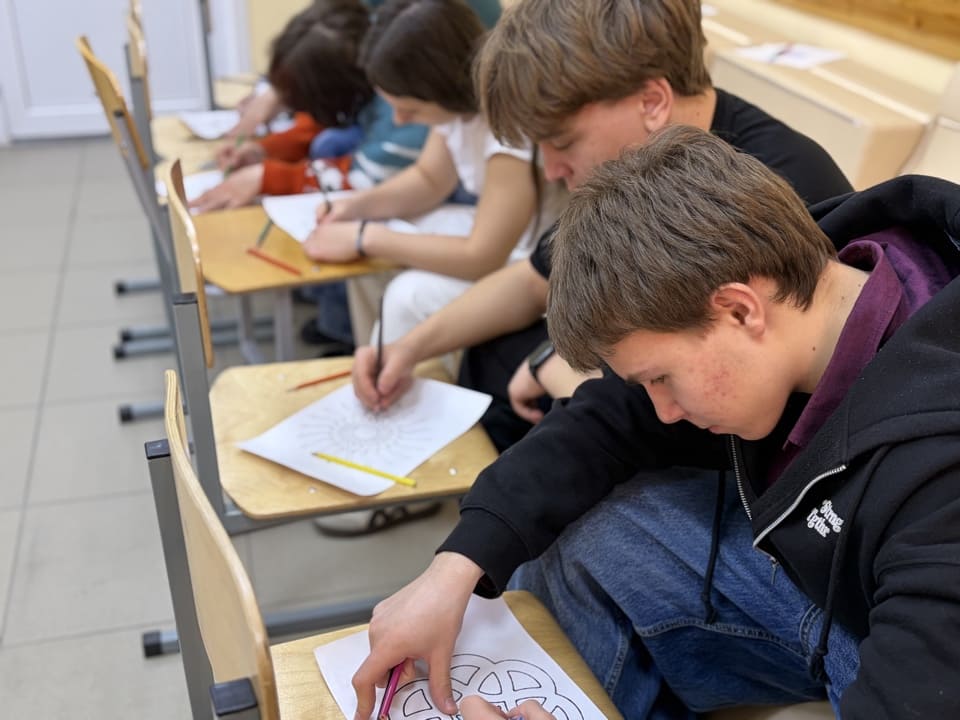 В начале участникам было кратко рассказано в презентации о символике и истории мандал, а также о том, как их создают и используют для медитации. Затем студенты получили чистые листы, карандаши и другие материалы для творчества.