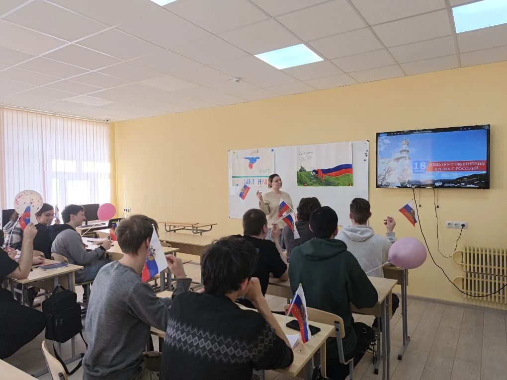 Заведующий отделением Кириченко Е. Е. и классный руководитель группы 47ИС Лебеда Я. В. организовали классный час, приуроченный ко Дню воссоединения Крыма с Россией.
