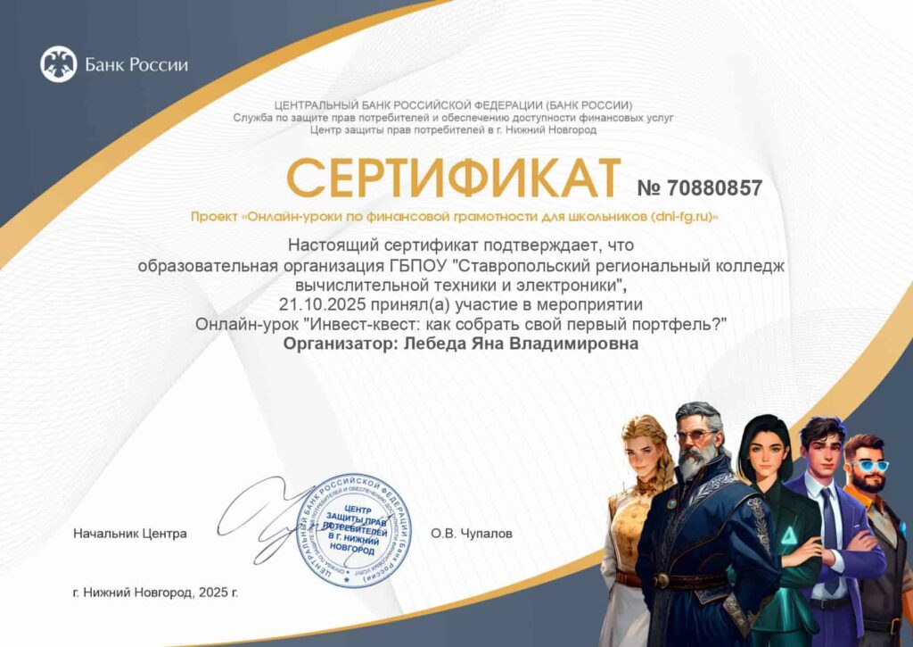 21 октября студенты колледжа стали участниками онлайн-занятия по повышению уровня финансовой грамотности, организованного Банком России, под названием «Инвест-квест: как собрать первый портфель?».