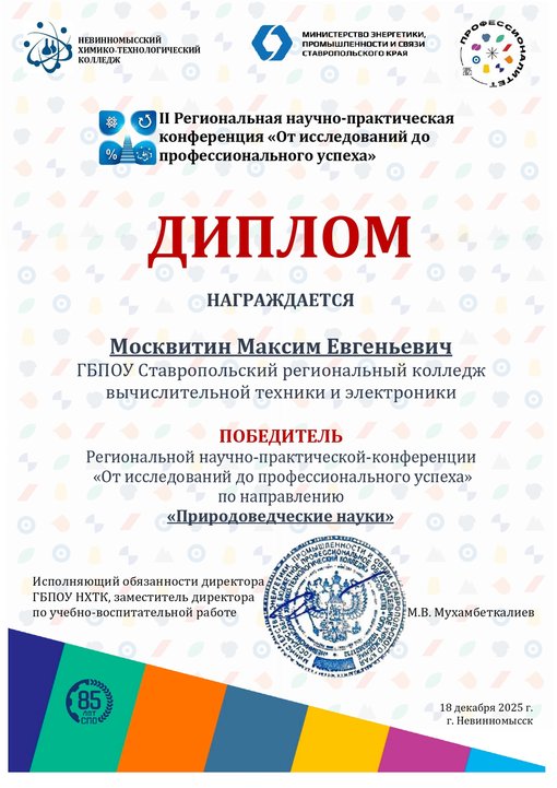 Москвитин Максим, студент группы 27/1 ПР, под научным руководством преподавателя физики Гуменной Ларисы Анатольевны, завоевал звание победителя в секции «Природоведческие науки».