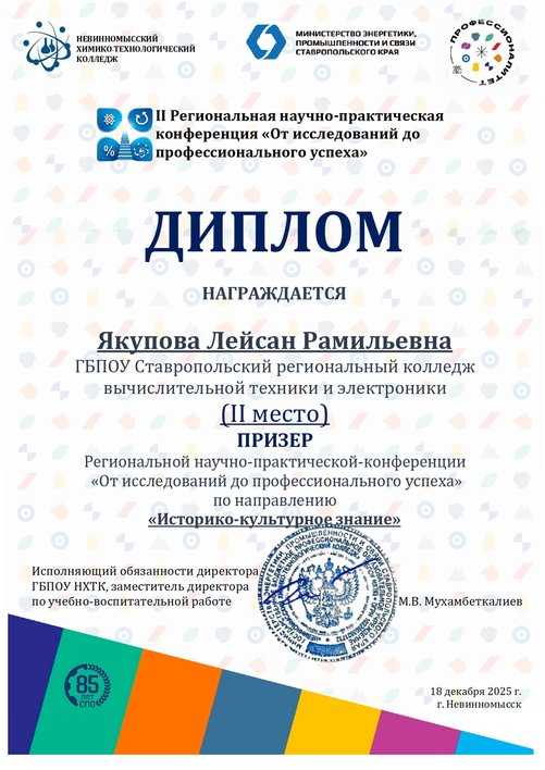 Якупова Лейсан из группы 27 «Веб», работавшая под руководством учителя истории Морозовой Екатерины Вадимовны, стала призёром II степени в направлении «Историко-культурное знание».