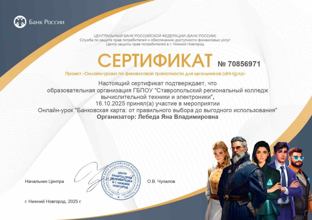 16 октября обучающиеся колледжа активно включились в образовательный процесс, приняв участие в серии онлайн-уроков по финансовой грамотности, организованных Банком России. Тема мероприятия была посвящена важной составляющей повседневной жизни современного человека — банковским картам.