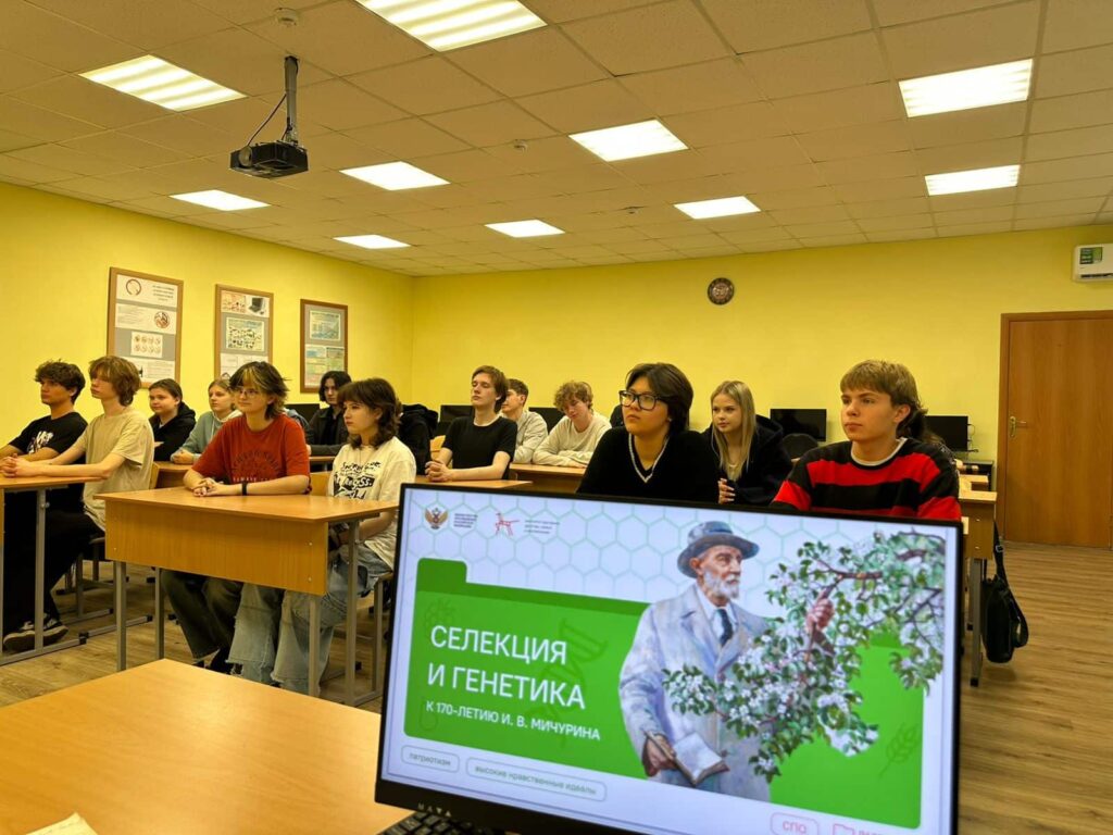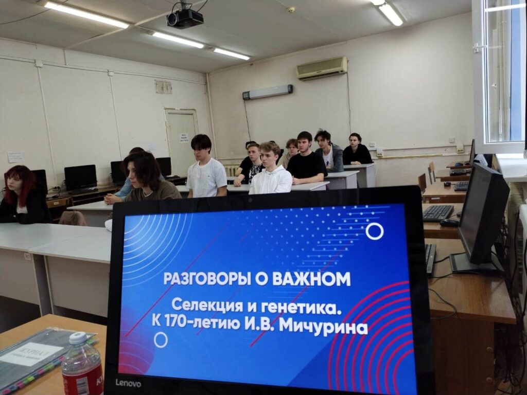 10 ноября в колледже прошли классные часы, организованные в рамках образовательного проекта «Разговоры о важном». Основной темой занятия стала наука — селекция и генетика, приуроченная к знаменательной дате — 170-летнему юбилею Ивана Владимировича Мичурина. Это событие стало важным этапом формирования у студентов понимания важности научного наследия выдающегося российского учёного и осознания значимости развития отечественной науки.