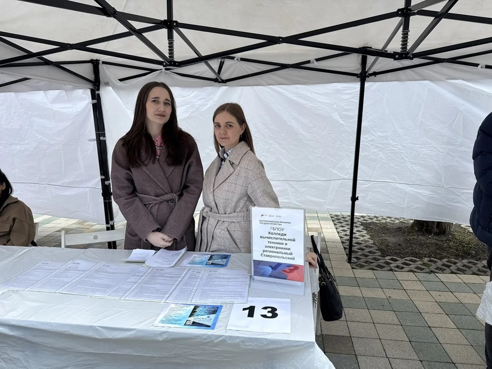 17 апреля 2026 года ГБПОУ СРКВТ и Э принял участие в региональном этапе Всероссийской ярмарки трудоустройства «Работа России. Время возможностей», который прошёл в городском парке «Парк Победы» города Ставрополя.
