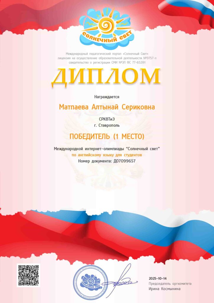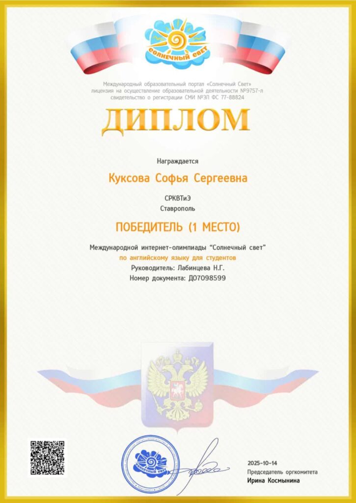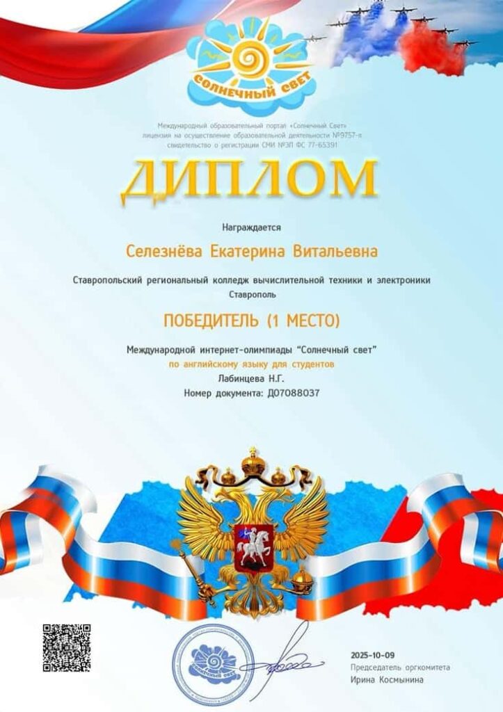 С 6 по 11 октября 2025 года обучающиеся нашего колледжа приняли участие во Всероссийской интернет-олимпиаде по английскому языку «Солнечный свет».