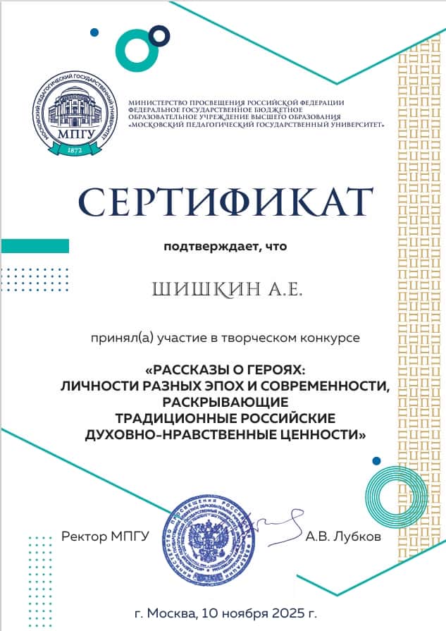 Студенты второго курса группы №23 Соловьёв С. А. и Шишкин А. Е. приняли участие в творческом конкурсе «Рассказы о героях: личности разных эпох и современности, раскрывающие традиционные российские духовно-нравственные ценности», проводимом Московским государственным гуманитарным университетом имени М. А. Шолохова.